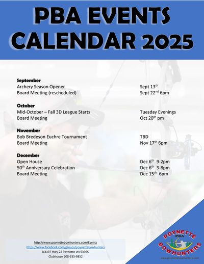 608-635-9852 info@poynettebowhunters.com Mailing address:: PO Box 342 Poynette, WI 53955